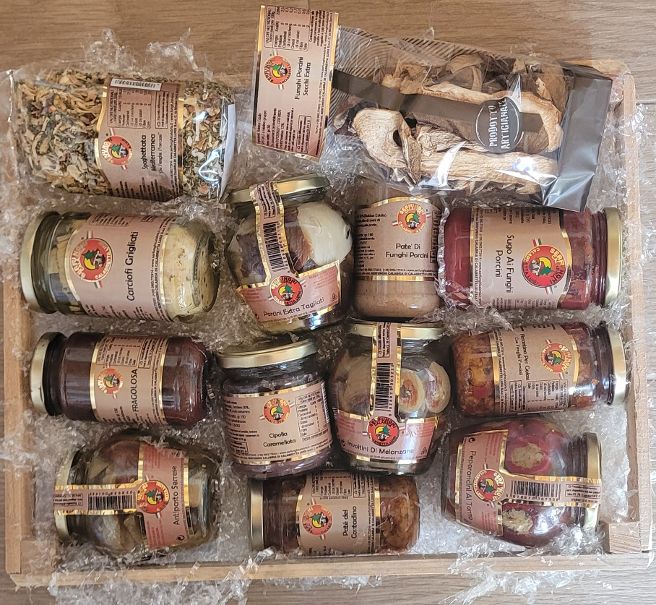 FUNGHI PORCINI SECCHI GR 50, PORCINI EXTRA TAGLIATI ML 314 V.O, PEPERONCINI AL TONNO ML 314,ANTIPASTO SERRESE ML 314 V.O, PICCANTINO PER GOLOSI ML 212, PATE' DEL CONTADINO ML 212, PATE' DI FUNGHI PORCINI ML 212, CARCIOFI GRIGLIATI ML 314, SUGO AI FUNGHI PORCINI ML 314, CIPOLLA CARAMELLATA ML 212, FRAGOLOSA ML 212, SPAGHETTATA MEDITERRANEA GR 80, INVOLTINI DI MELANZANE ML 314.