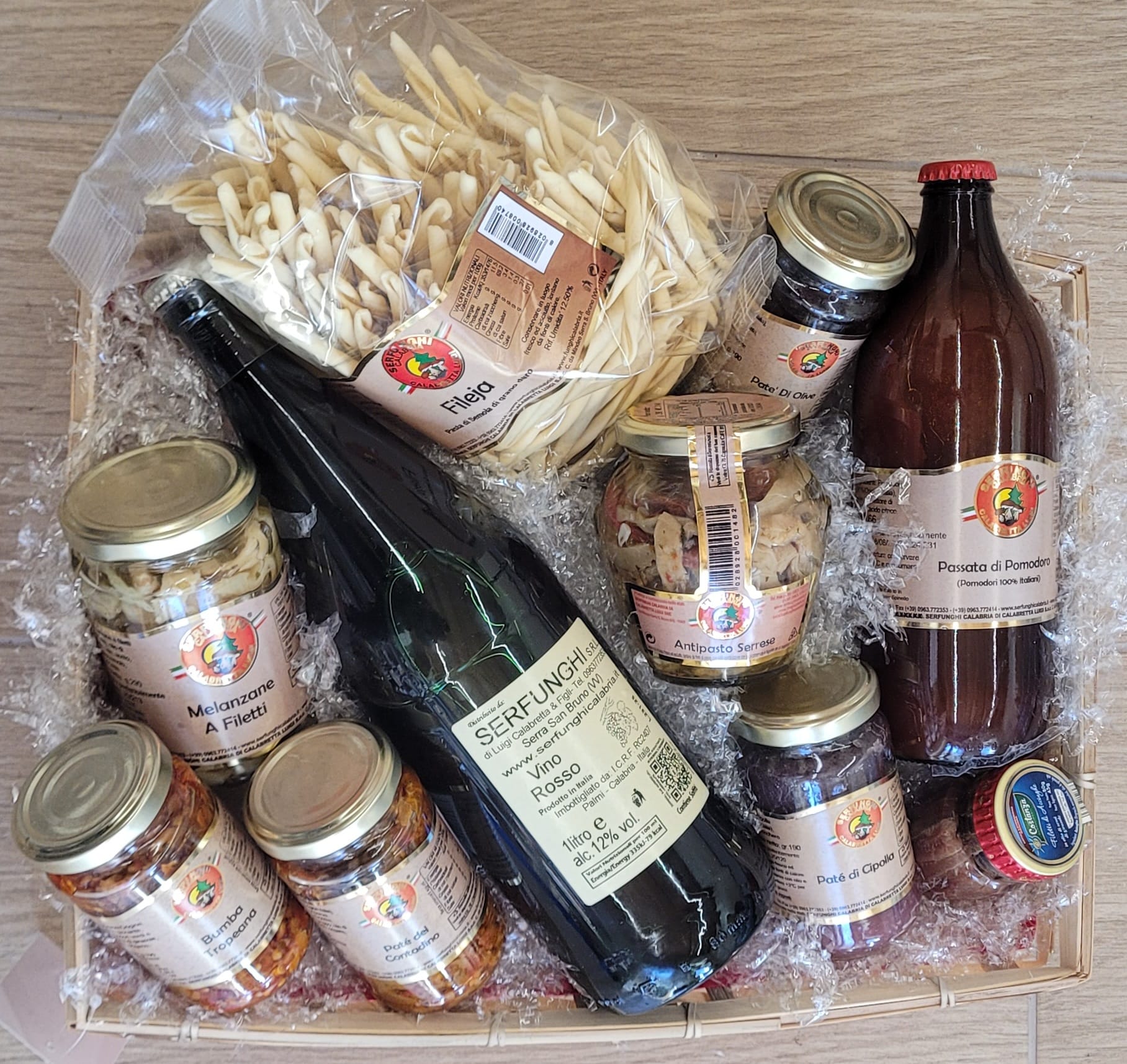 FILEJAS BIANCHE GR 500, MELANZANE A FILETTI ML 314 V.L, BUMBA TROPEANA ML 212, PATE' DEL CONTADINO ML 212, VINO LOCALE MARCA SERFUNGHI LT.1, PATE' DI CIPOLLA ML 212, FILETTI DI ACCIUGHE GR 80, ANTIPASTO SERRESE ML 314 V.O, PATE' DI OLIVE NERE ML 212, PASSATA DI POMODORO CL66.